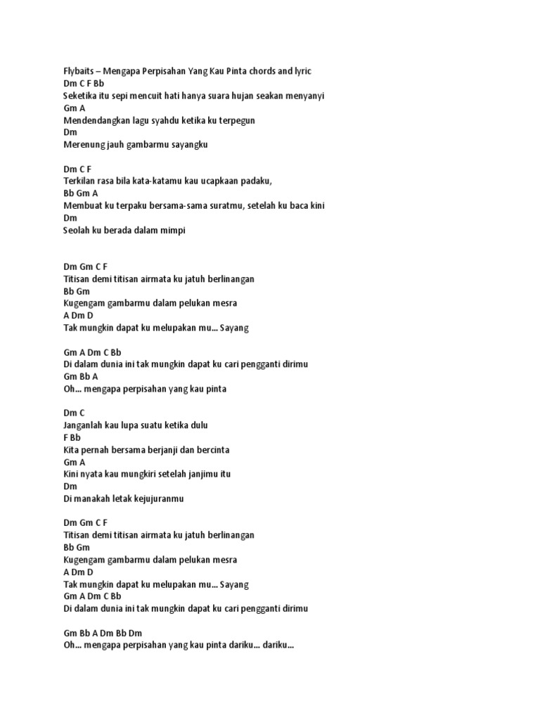 Mengapa Perpisahan Yang Kau Pinta CHORDS by Flybaits for GUITAR UKULELE and PIANO. CHORDS USED Dm Bb C F Gm A D no capo intro Dm Bb Dm Bb verse Dm C Seketika itu sepi mencuit hati F Bb Hanya suara hujan seakan menyanyi Gm mendendangkan lagu syahdu A Ketika ku terpegun Bb C A merenung jauh gambar mu sayangku Dm C Terkilan rasa bila kata katamu F Bb Kau. Correct tabs content with proposed changes.
