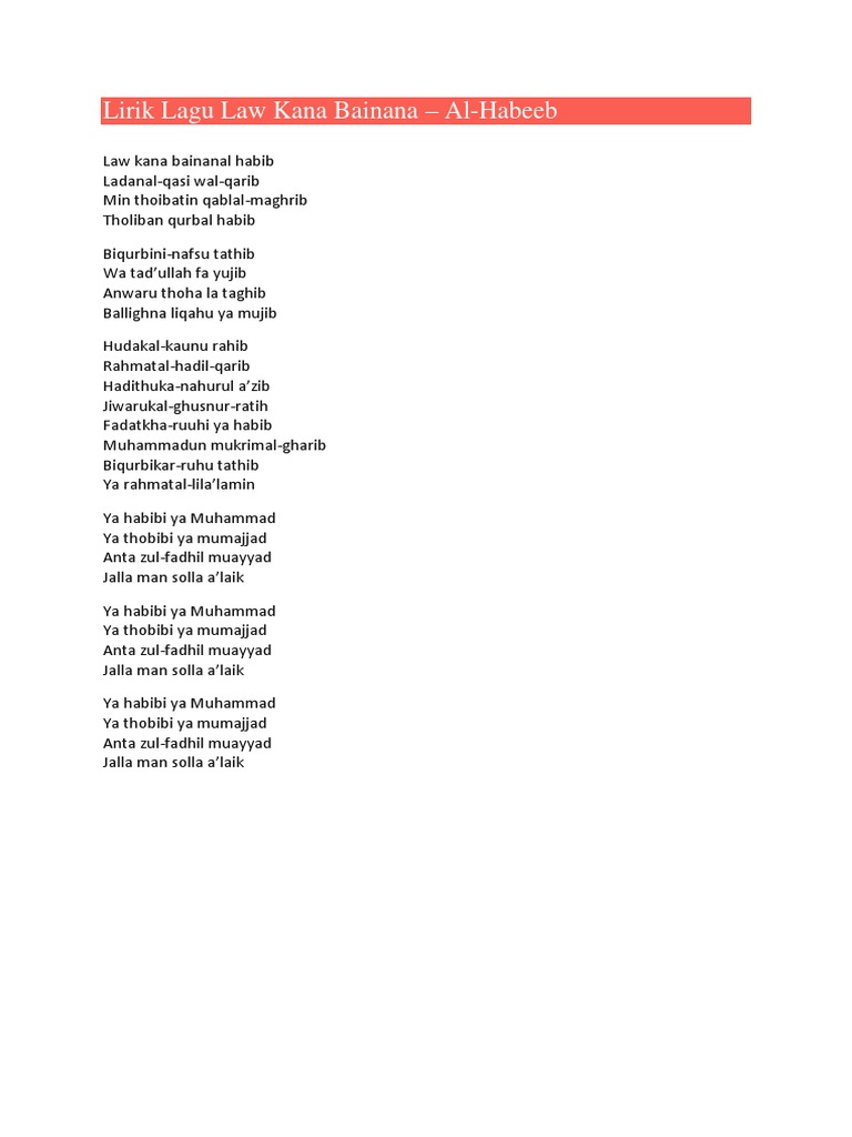 Laukanal Bainal Habib Sabyan Lyrics Law kana bainanal habib Ladanal-qasi wal-qarib Min thoibatin qablal-maghrib. Kunci Gitar Innal Habibal Musthofa - Ai Khodijah El Mighwar. F Hingga akhirnya G C Kau pergi tinggalkan aku.